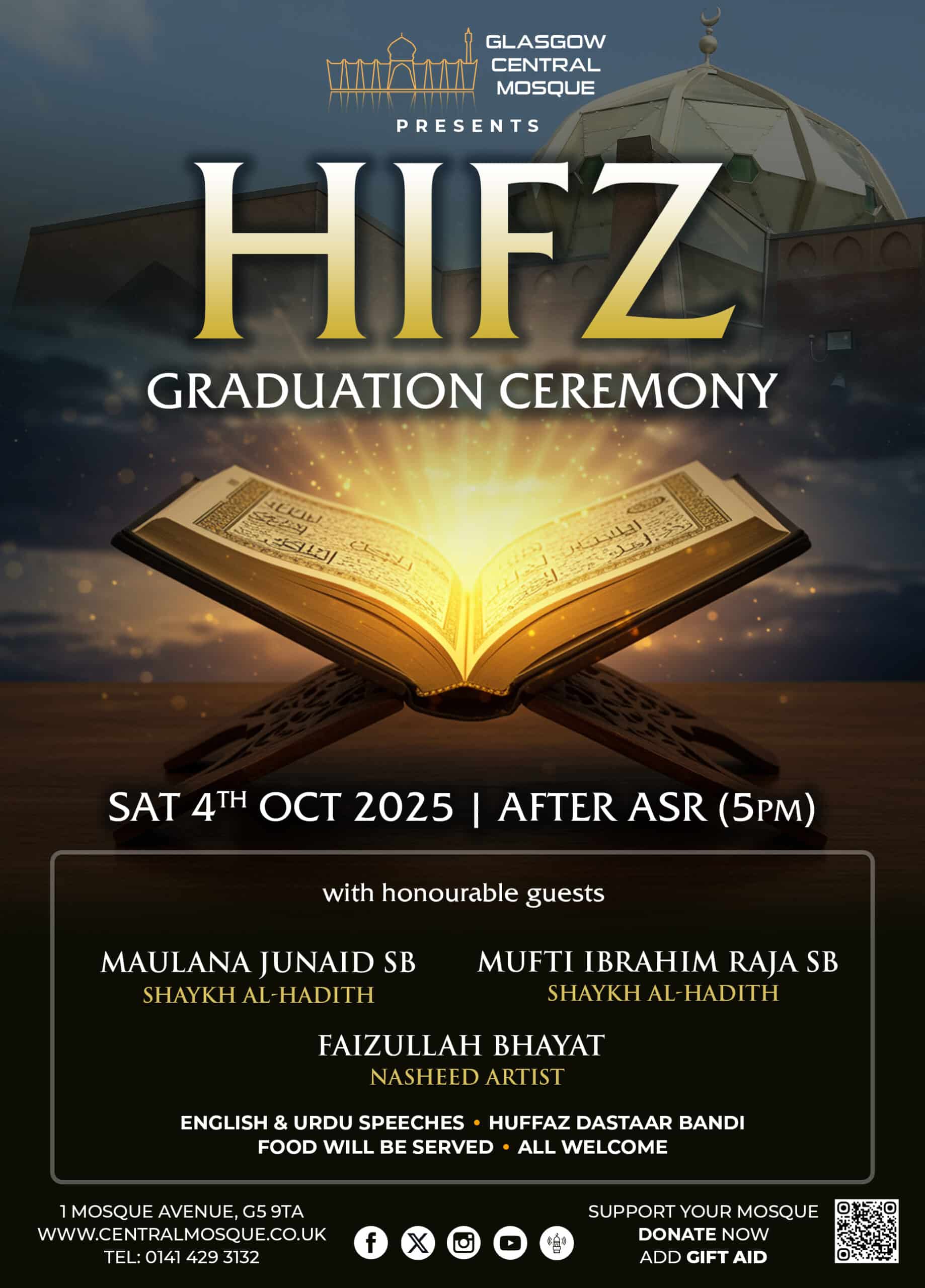 Glasgow Central Mosque is delighted to host its annual Hifz Graduation Ceremony on Saturday 4th October in the company of our honourable guests. This will take place after the Asr […]