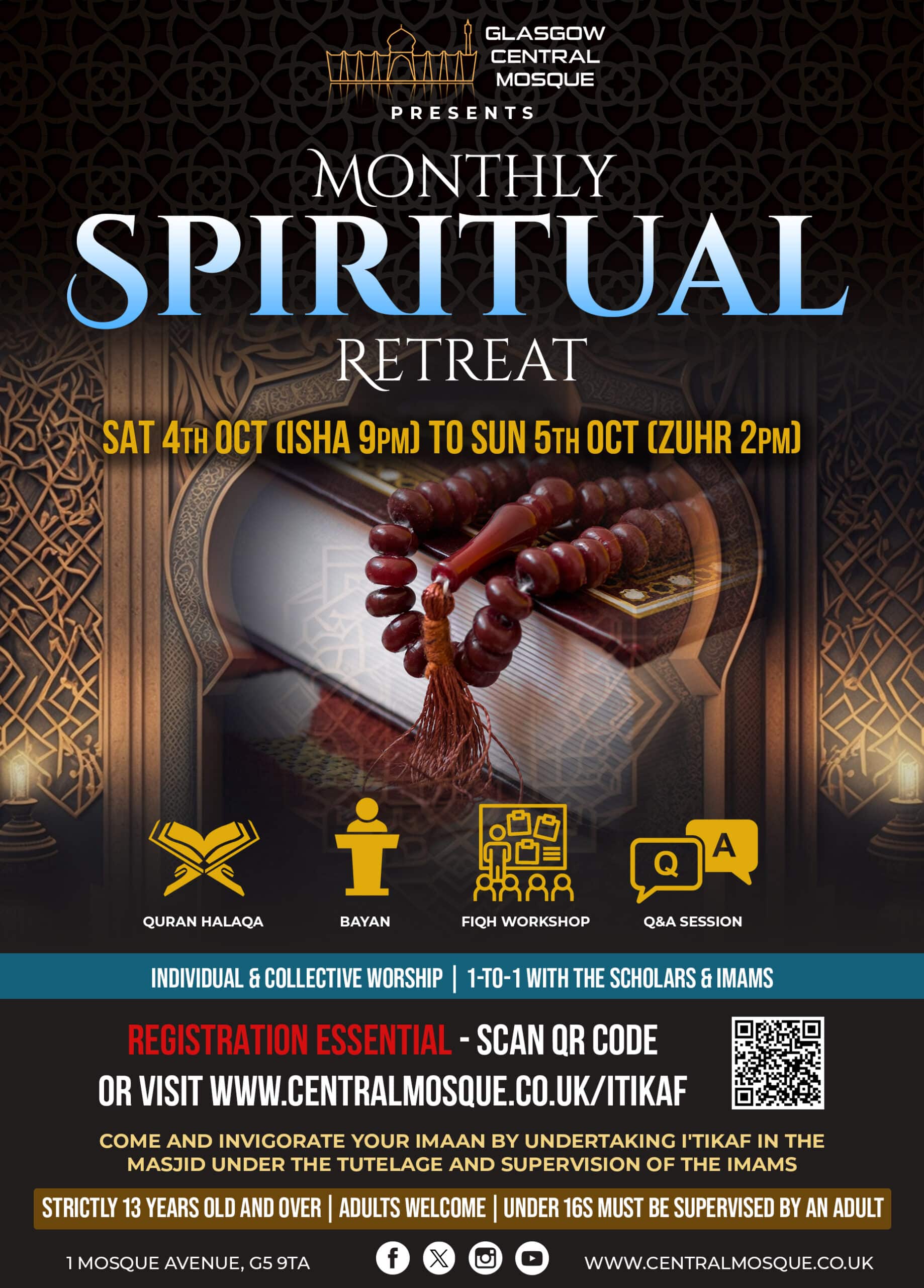 The monthly Spiritual Retreat I'tikaaf programme will continue in Glasgow Central Mosque from Sat 4th Oct (Isha 9pm) to Sun 5th Oct (Zuhr 2pm), In’sha’allah. Please register HERE.