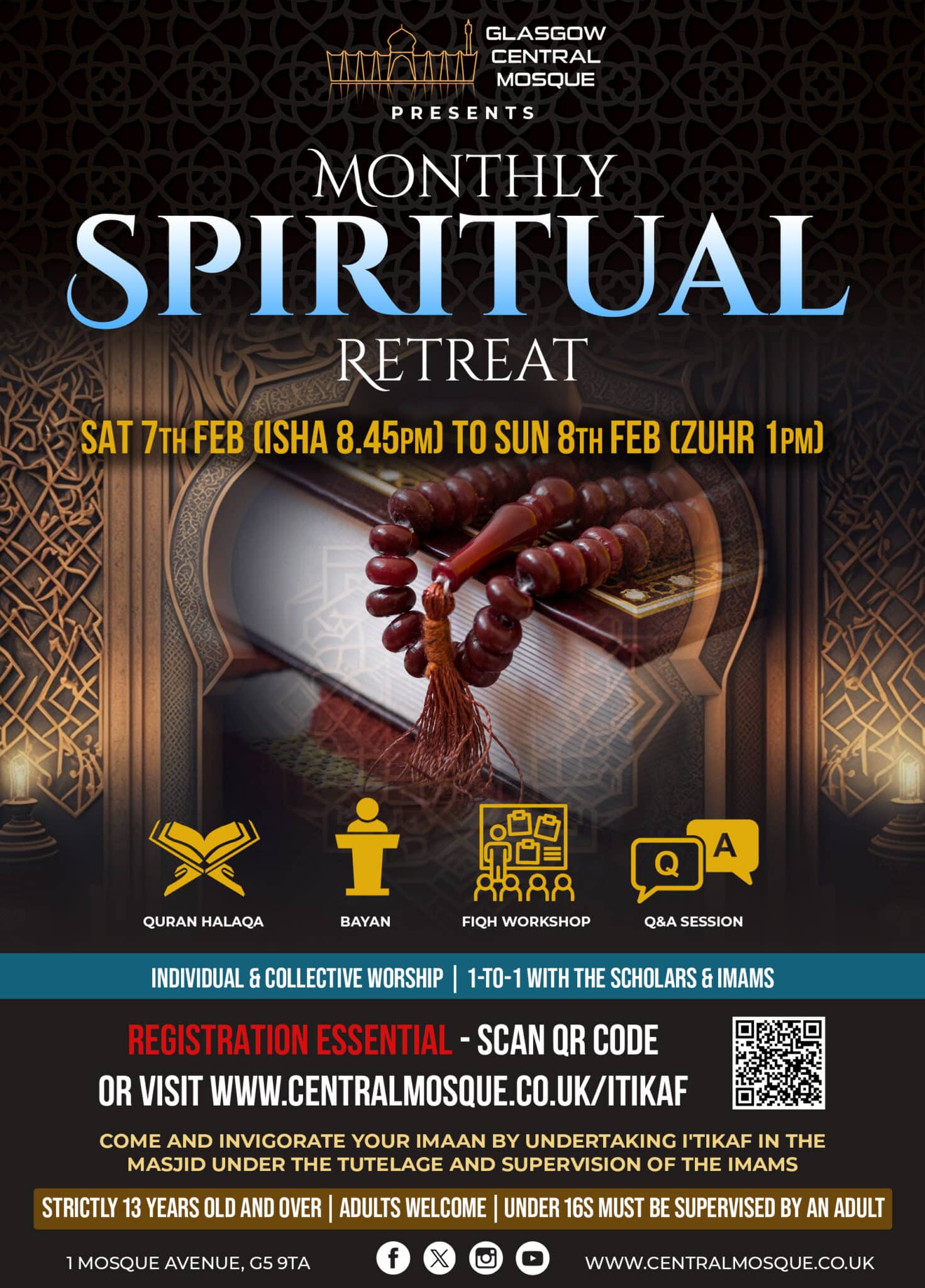 The monthly Spiritual Retreat I'tikaaf programme will continue in Glasgow Central Mosque from Sat 7th Feb (Isha 8.45pm) to Sun 8th Feb (Zuhr 1pm), In’sha’allah. Please register HERE.