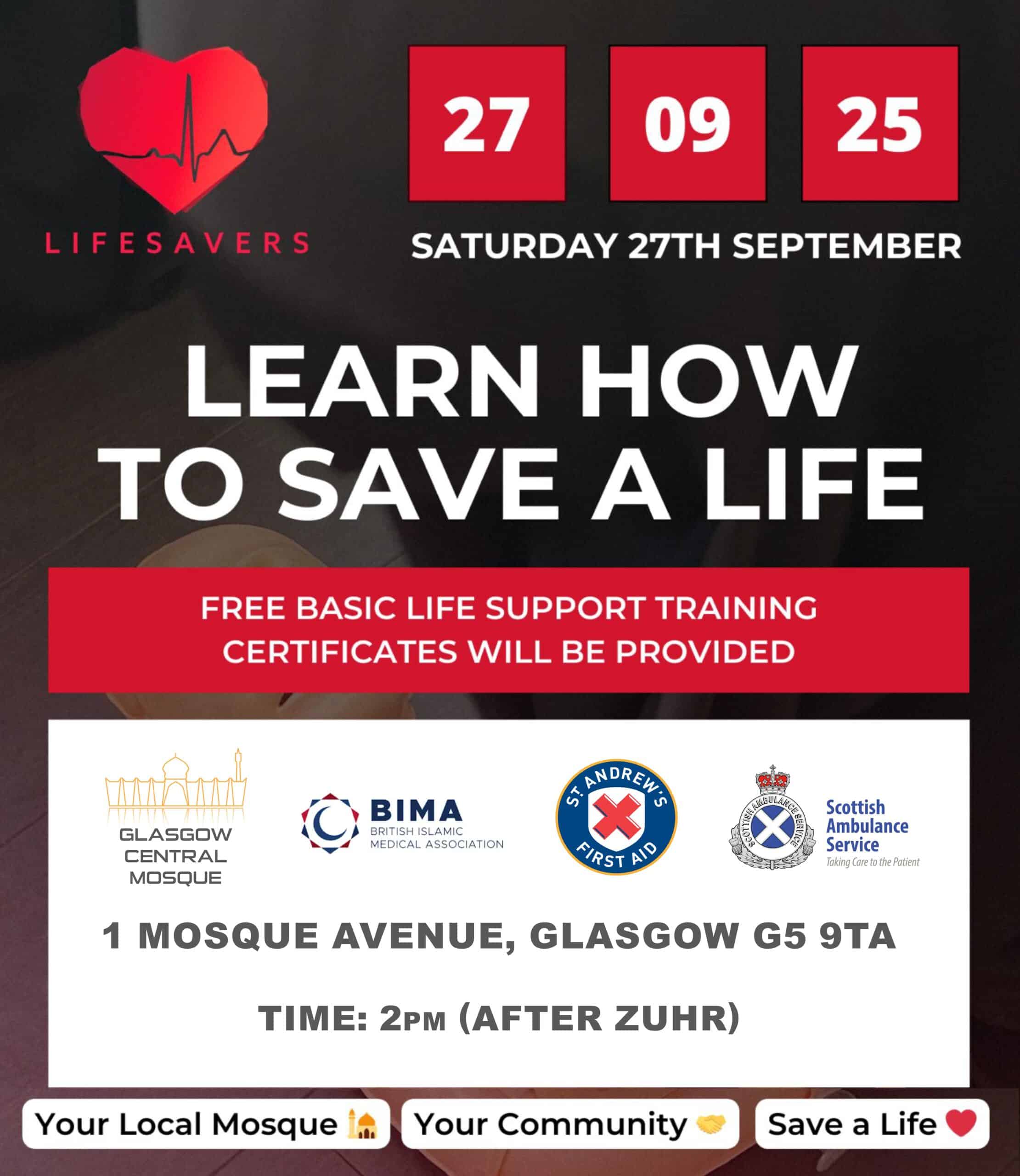 This Saturday, 27th September at Glasgow Central Mosque, after Zuhr (2pm), the Scottish Ambulance Service, St Andrews First Aid and the British Islamic Medical Association will host a lifesavers event where doctors & healthcare professionals will be covering CPR, the Recovery Position and Choking.